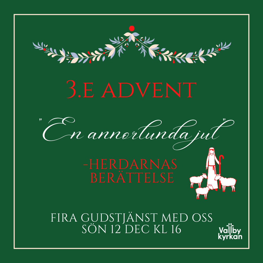 Välkommen till en stämningsfull adventsgudstjänst med adventsånger, solosång och mycket mer. Pastor Christer Dahlberg ger en betraktelse över herdarnas berättelse den första julen. Innan gudstjänst bjuder vi på glögg och pepparkaka och efter gudstjänsten serveras kaffe, te och adventsfika!